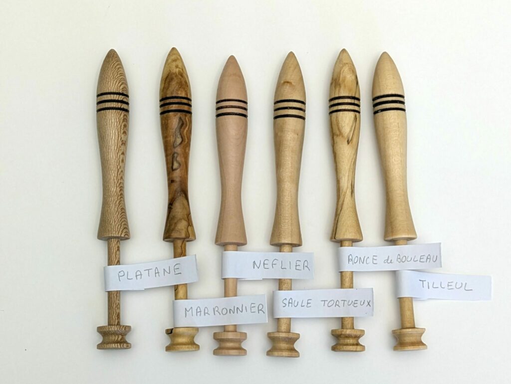 J’ai été amené à fabriquer un 2e lot de 12 fuseaux en juin, puis un 3e de 5 fuseaux en octobre ! Dans chaque cas avec de nouvelles essences de bois bien entendu.